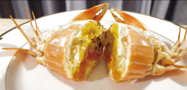 黃油相融,難分彼此。油膏浸滿整只蟹身,腹肉、蟹腿、蟹螯,甚至蟹腮,全身都金黃透光。細細品嘗,渾身散發(fā)一股霸道的鮮甜,是普通青蟹的10余倍,簡直就是“人間尤物”。
